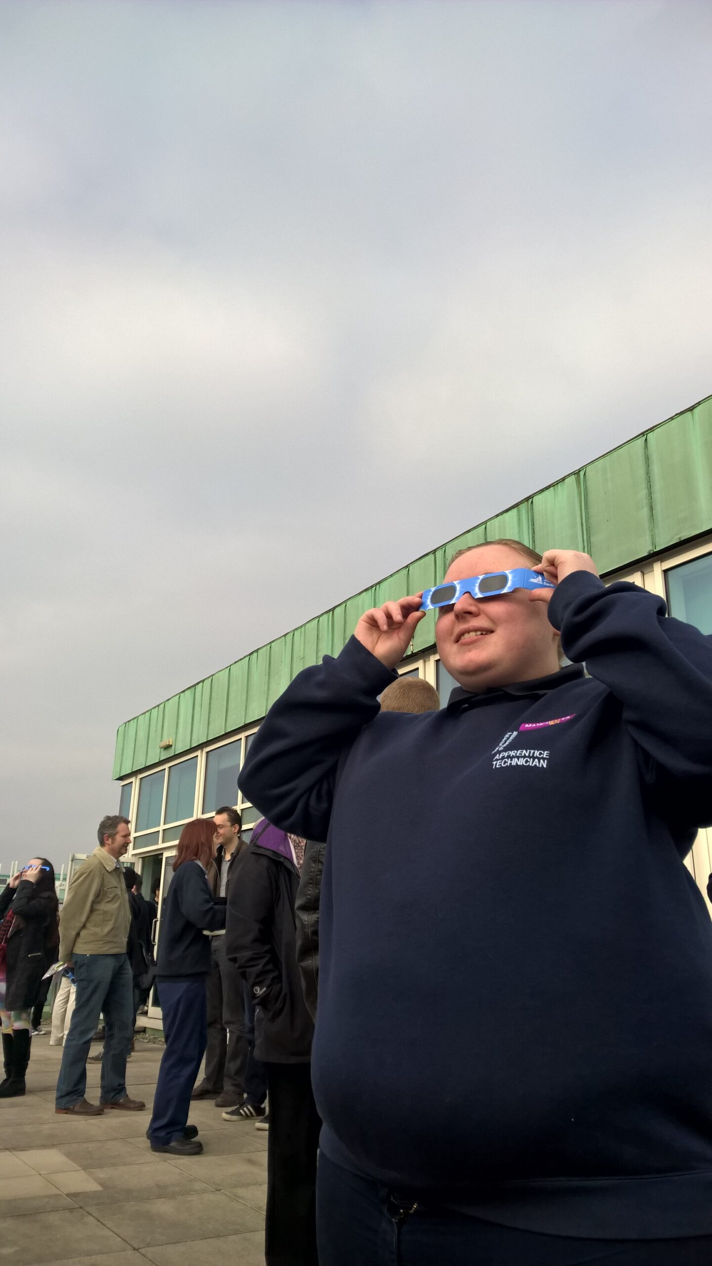 EPS apprentices and staff spent an hour patiently waiting for the cloud cover to reveal glimpses of a solar eclipse. This event is when the Moon passes between the Sun and the Earth hiding the sun from view and blocking the sunlight that usually reaches us. The sun appeared to go partly dark for about two hours as the moon passed in front of it.