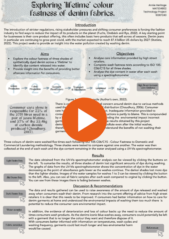This project explores the homecare stage of denim jeans. This will be investigated by analysing the colour fastness to washing for three shades of synthetically dyed denim across a series of washes simulating a garments ‘lifetime’ rather than one wash as stated in British Standards BS EN ISO 105-C10: 2007.