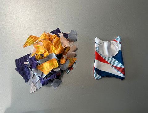 Turn the plushie inside out and use the unstitched portion to stuff the excess scrap fabric into the plushie.