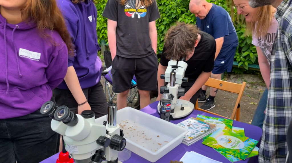 Organised by the University of Manchester’s Dr David Bailey in collaboration with Friends of Medlock Valley, the event was led by ecologist Dr Cecilia Medupin, alongside a team of undergraduate and postgraduate student ambassadors. With microscopes set up by the river, freshwater invertebrate identification guides available, and children’s science storybook on freshwater invertebrates (produced by one of our students), the workshop welcomed 25 attendees for an afternoon of environmental learning, discovery, and ecological exploration. The visitors ranged from 9-year-olds to professionals in their 50s.