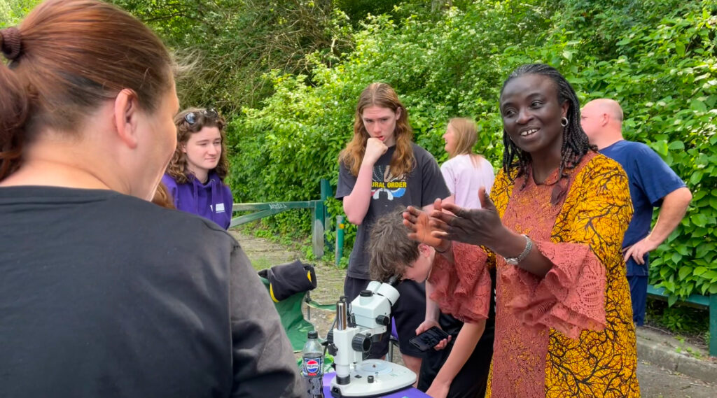 Using the Freshwater Biology Association freshwater name trail and microscopes, attendees learnt to distinguish these types of organisms to explore what biodiversity reveals about local environmental conditions. Discussions flowed naturally as attendees asked: why do some bugs survive, while others disappear? What does this tell us about pollution levels? How can we protect these ecosystems?